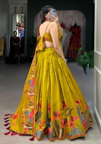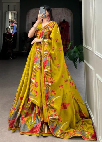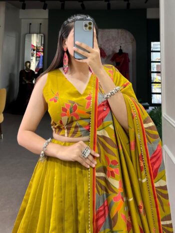 Exquisite Floral Fantasy: Polyester Viscose Chanderi Lehenga Choli with Intricate Print and Dupatta 🩷💛